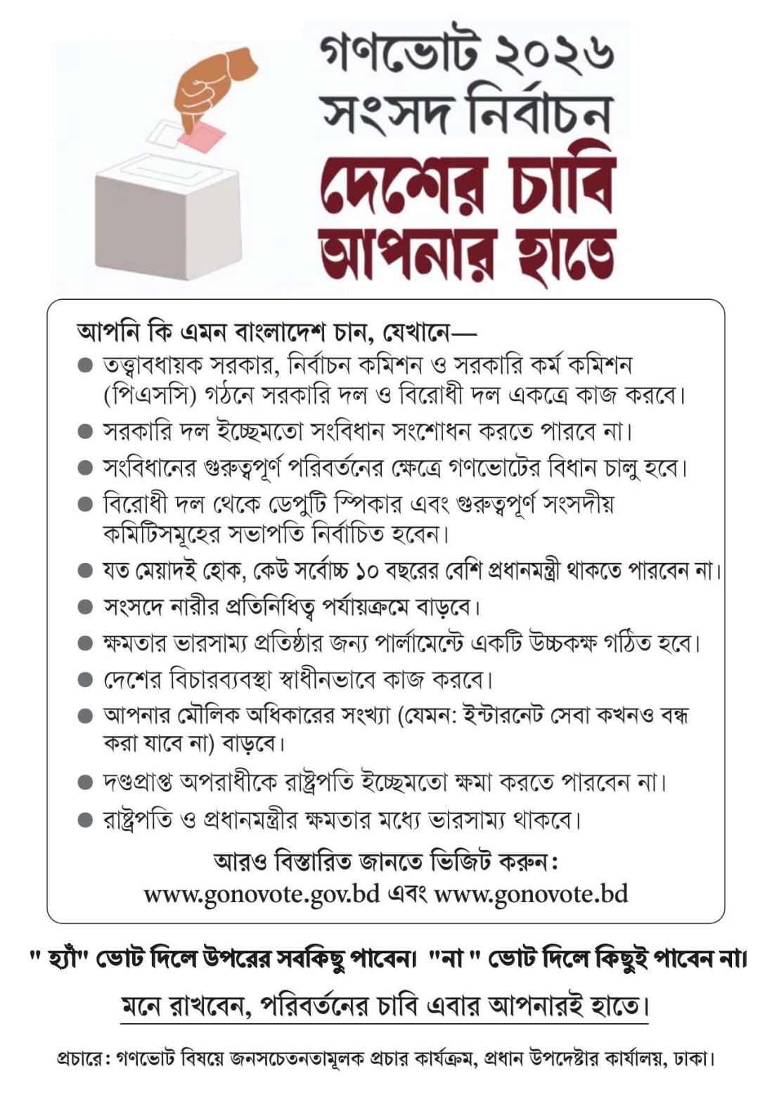 গণভোট ও জাতীয় নির্বাচন ২০২৬ আগামী ১২/০২/২০২৬ খ্রি: তারিখে অনুষ্ঠিত হবে।